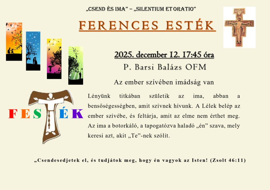 December 12-én este 3⁄4 6-kor a Ferences Esték sorozatban Dr. Barsi Balázs tart előadást „Az ember szívében imádság van” címmel. Mindenkit szeretettel hívunk és várunk.